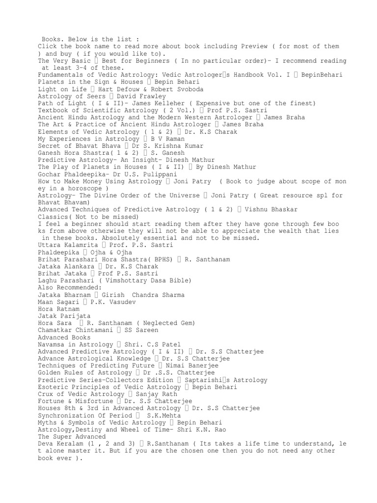 Free Astrology eBooks - Ancient Astrology PDF books Download PDF eBook with reformatted/retyped text (easy-to-read font) ( large print 18px) ASTROLOGY IN RELATION TO MIND and CHARACTER By A Mental Specialist ( 1924) Everybody's Astrology By Magnus Jensen ( 1922) The Light of Egypt: Science of the Soul and the Stars, Volume II By Thomas H. Burgoyne ( 1903) Download PDF eBook Books by K.N. Rao (Author of The Nehru dynasty) - Goodreads Average rating 4.09 · 333 ratings · 11 reviews · shelved 3,401 times. Showing 30 distinct works. « previous 1 2 3 next ». sort by. The Nehru dynasty: Astro-political portraits of Nehru, Indira, Sanjay & Rajiv. by. K.N. Rao. 4.06 avg rating — 63 ratings — published 1993 — 2 editions. Want to Read. PDF Vedic Astro Textbook - Astrology & Spirituality Resources experimentation. I may try to edit this book or write a new book in future, reflecting the refinements in knowledge. However, I think that the book may still be useful for clarifying some basic concepts and preparing the ground for advanced studies. So I am sharing this book freely with all. Some of my researches are shared as free articles on All Astrology Documents ACCESS : DIVYASTRO : Free Download, Borrow, and ... The only trouble I had was to distinguish some of the books of The Wheel of life- pag 24- . But anyway this is an altruist iniciative. ... links for all astrology documents by topics.pdf download. 230.6K . links for astro Books & Jyotish_sept 2018.pdf download. 93.1K . links for astro Magazines_Vedic.pdf download. 94.2K . links for astro ...