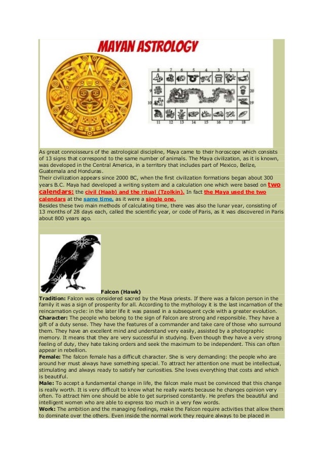 Mayan Astrology | Horoscope.com: Astrology, Horoscopes, Tarot ... Mayan astrology is a variation of Mesoamerican astrology, one of the most forward-thinking kinds of astrology of its time. The Mayan Calendar, or Tzolk'in, is comprised of 20 Day Signs and 13 Galactic Numbers, making a 260-day calendar year.