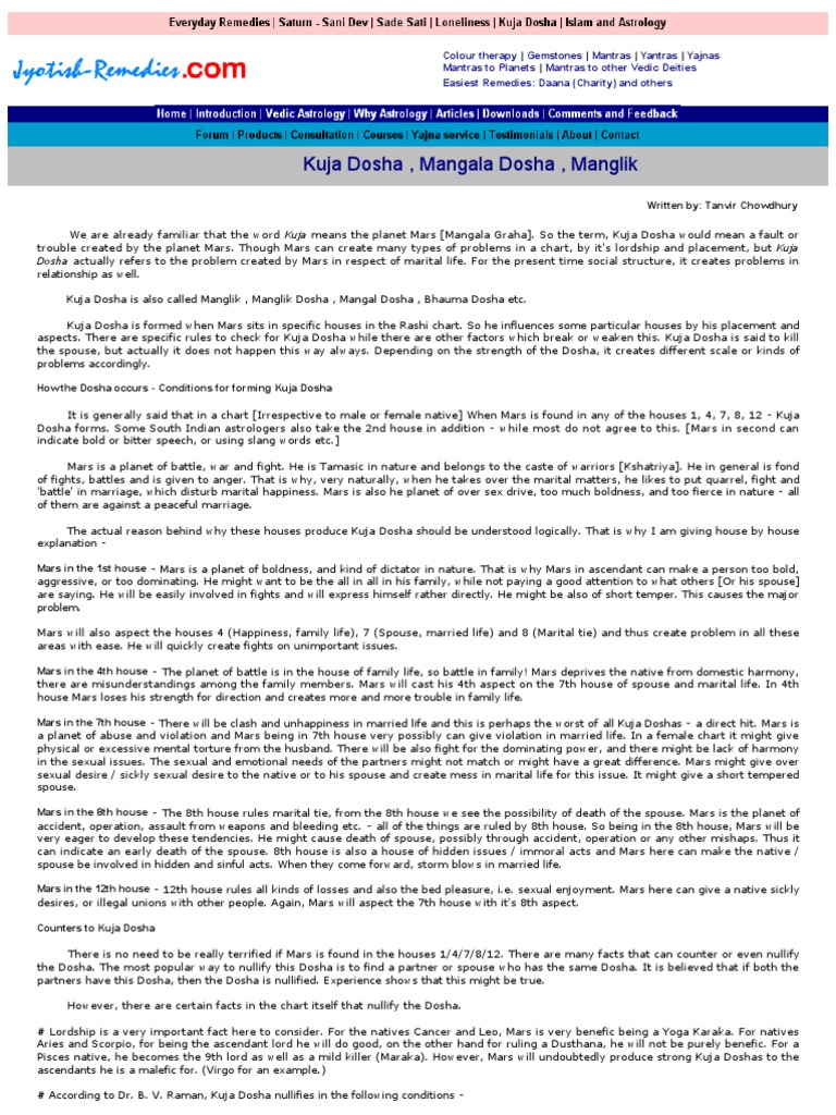 Mangal Dosha | Kuja Dosha Calculator | Manglik Dosha Finder - Drikpanchang This page finds the Mangal Dosha in a person's birth Kundali or Horoscope as per Vedic Astrology. If one knows date, time and place of the birth then the precise nature and intensity of Mangal Dosha in the birth Horoscope of a person can be calculated. Mangal Dosha is also known as Manglik Dosha, Bhauma Dosha and Kuja Dosha. The Astrological Truth Behind Kuja Dosha: Effects on Marriage What is Kuja Dosha? What is Mars Dosha? Our sages said that when Mars is posited in 2th, 4th, 7th, 8th and 12th houses from Lagna or Moon or Venus, it is said to be Mars Dosha or Mangal Dosha and the native is called Manglik But most of the astrologers take the placement only from Lagna (Ascendant). This is not perfect. Mars Dosha / Kuja Dosha / Manglik dosha / Chevvai Dosha Mars is considered a Malefic planet in Vedic astrology. Its placement in 1st,2nd, 4th, 7th,8th, and 12th house causes Mars dosha (Kuja dosha / Manglik dosha / Chevvai dosha). The dosha gets nullified with some exceptions mentioned below: 1. No dosha, if Mars / Kuja placed in Aries (Mesha), Vrischika (Scorpio), and in Capricorn (Makara) 2.