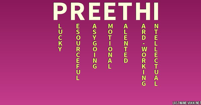 Preethi Name Meaning - Preethi Meaning & Definition - Hamariweb.com Preethi is a Hindu Girl name, and Preethi name meaning is Clean; Love. It is an Hindi-originated name and the associated lucky number is 9. Preethi is a long name with 7 letters. Preethi Meaning Preethi Name Popularity & Rank : 10808 Preethi Name Meaning in Hindi Similar Preethi Girl Names Priyanka Prisha Priya Priyanshi Pinky Pihu Prachi Puja