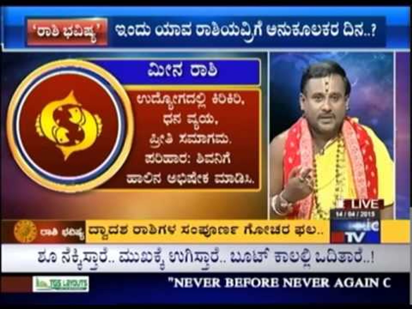 ದೈನಂದಿನ ರಾಶಿ ಭವಿಷ್ಯ, Dina Bhavishya, Daily Rashi Bhavishya in Kannada ... ದೈನಂದಿನ ರಾಶಿ ಭವಿಷ್ಯ dina bhavishya, means Daily Rashi Bhavishya in Kannada. This daily horoscope in Kannada is based on Vedic Astrology. Check out Kannada Rashi Bhavishya now.