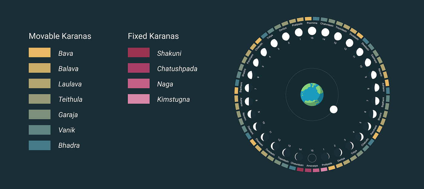 Karana Calculator - Free Panchanga, Vedic astrology calculators Karana Calculator. A karana is half of a tithi in duration. A karana is the time required for the angular distance between the sun and the moon to increase in steps of 6° starting from 0°. There are eleven karanas in total. Of the eleven karanas, four are fixed and occurs only once in a cycle.