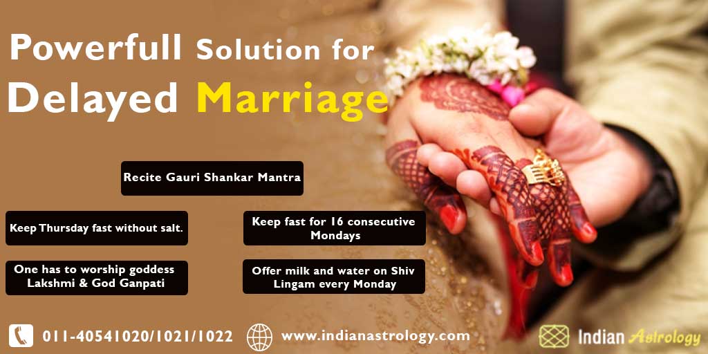 Late Marriage In Astrology - Remedies For Delay In Marriage Remedies For Late Marriage In Astrology If you are facing delay in marriage, you can exercise these powerful remedies for late marriage in astrology and Lal Kitab. Read more: Worship Maa Parvati and Lord Shiva. Worshipping these two can help you in a surprising manner. Worship them continuosly for happy married life.