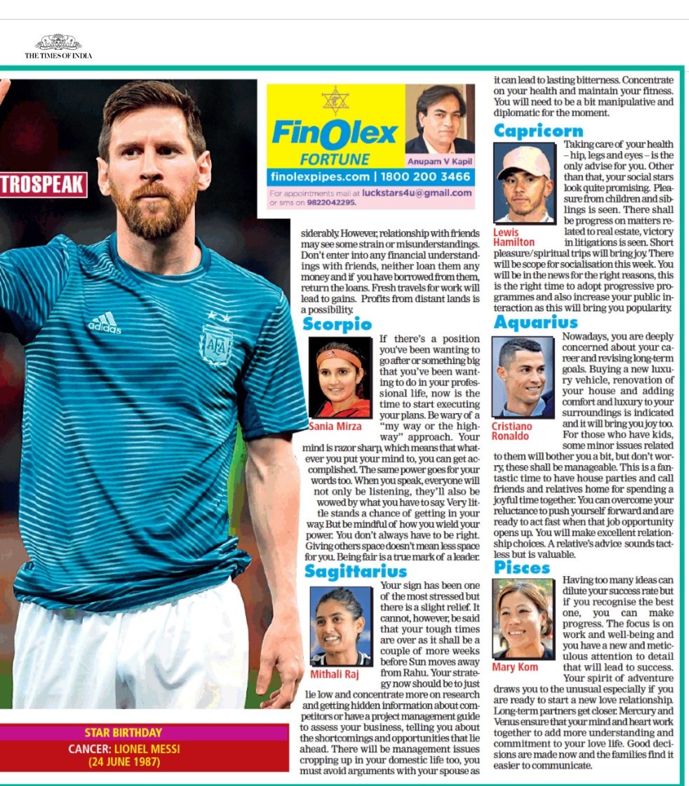 Anupam V Kapil - My daily astrology predictions Column... | Facebook Anupam V Kapil. May 31, 2015 ·. My daily astrology predictions Column "Finolex Fortune" in the Times of India completes 10 years in May 2015. Thanks would be too mild a word for the affection my readers have shown over the years and this May is a special month, as my daily astrology predictions column, "Finolex Fortune" completed 10 years and ...